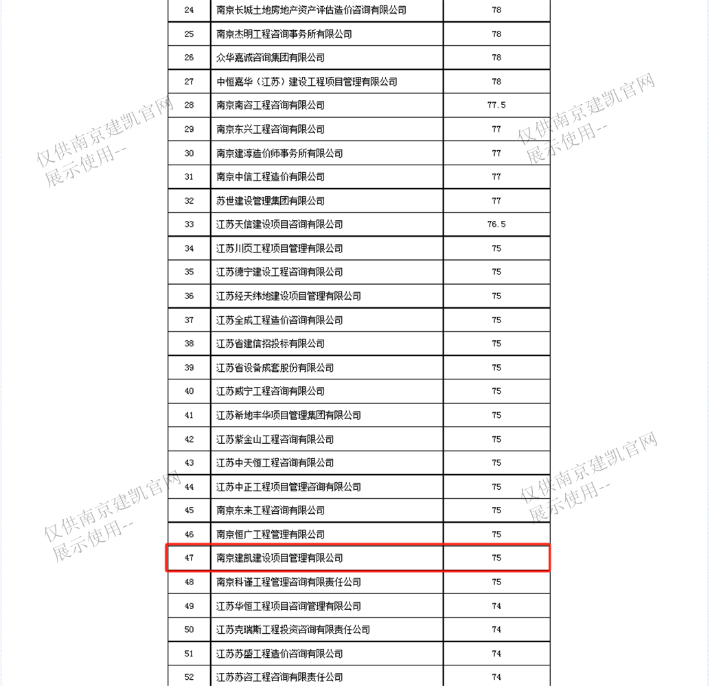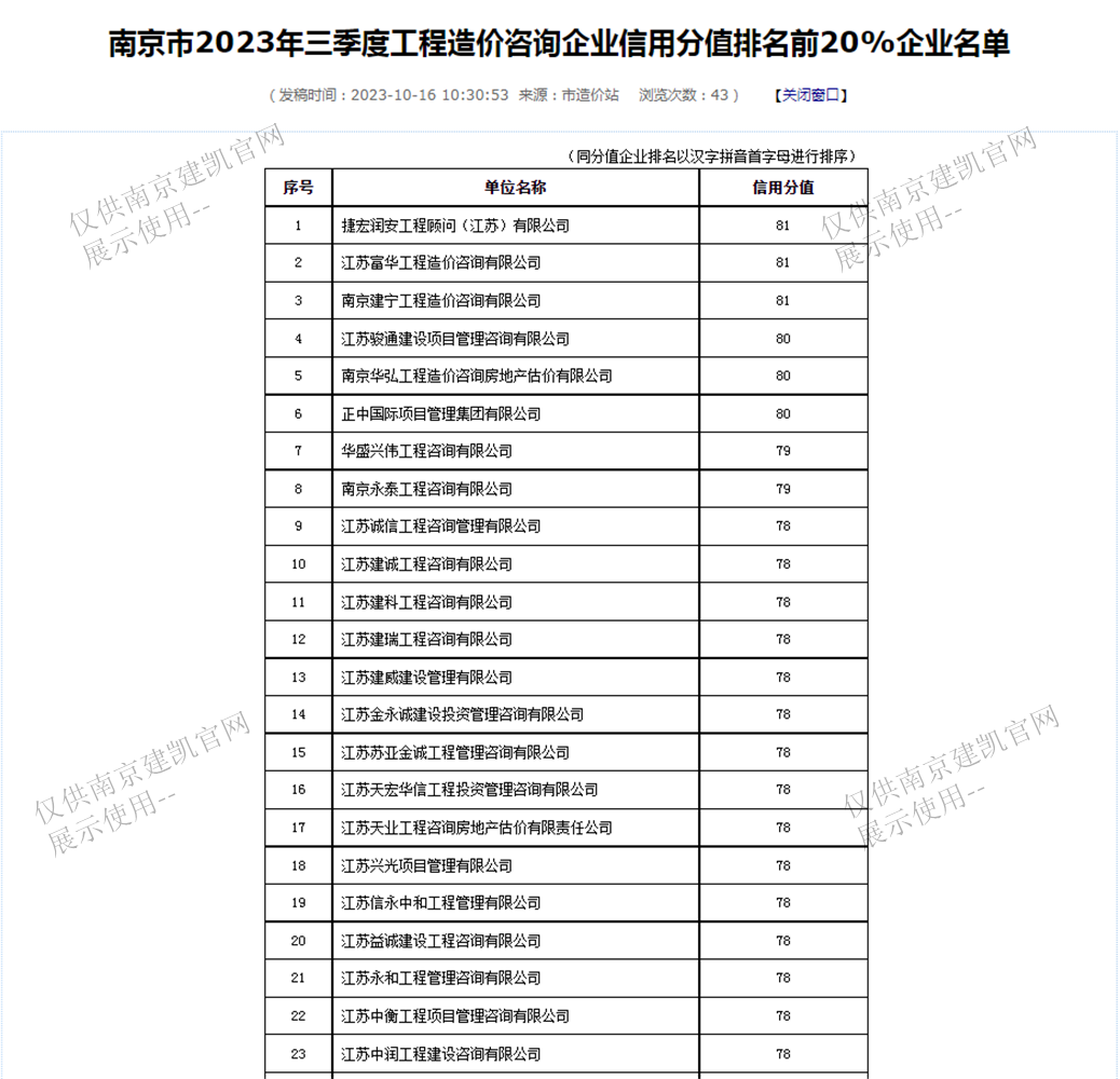 恭喜我司入選“南京市2023年三季度工程造價(jià)咨詢企業(yè)信用分值排名前20%企業(yè)名單”