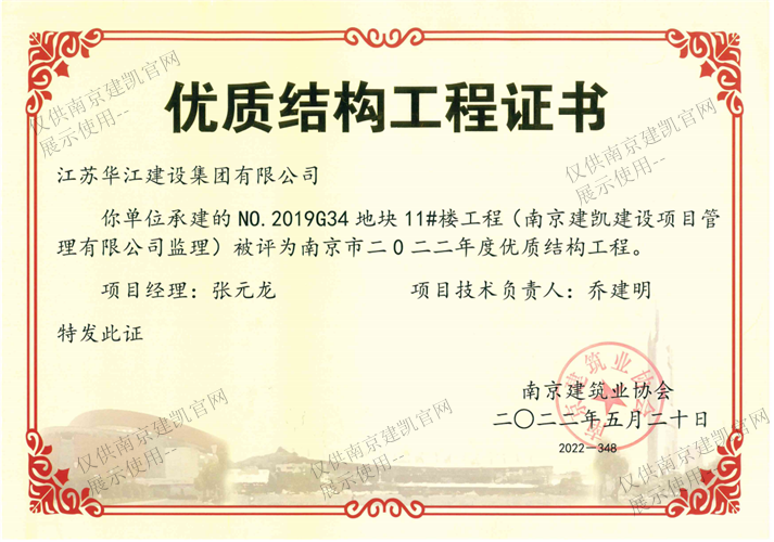南京市二0二二年度優(yōu)質(zhì)結(jié)構(gòu)工程(NO.2019G34地塊11#樓工程)