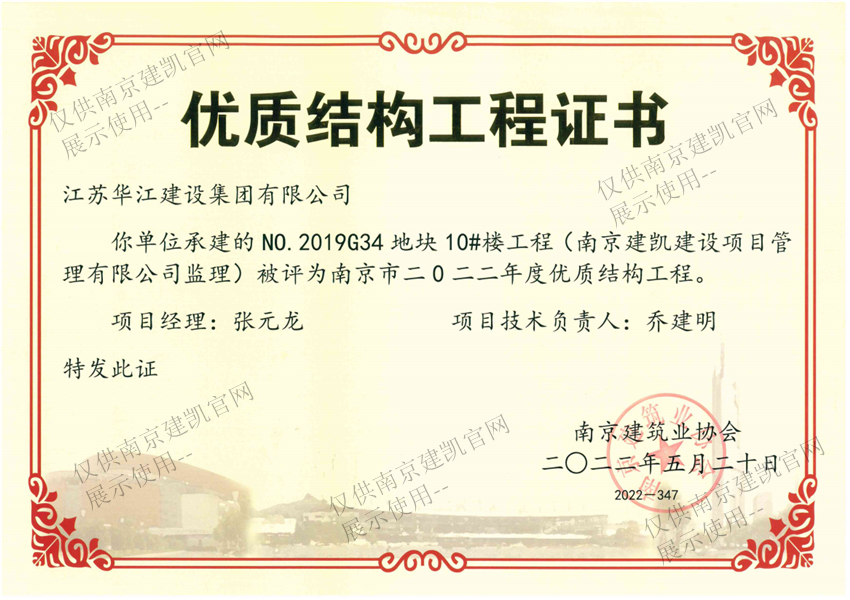 南京市二0二二年度優(yōu)質(zhì)結(jié)構(gòu)工程(NO.2019G34地塊10#樓工程)